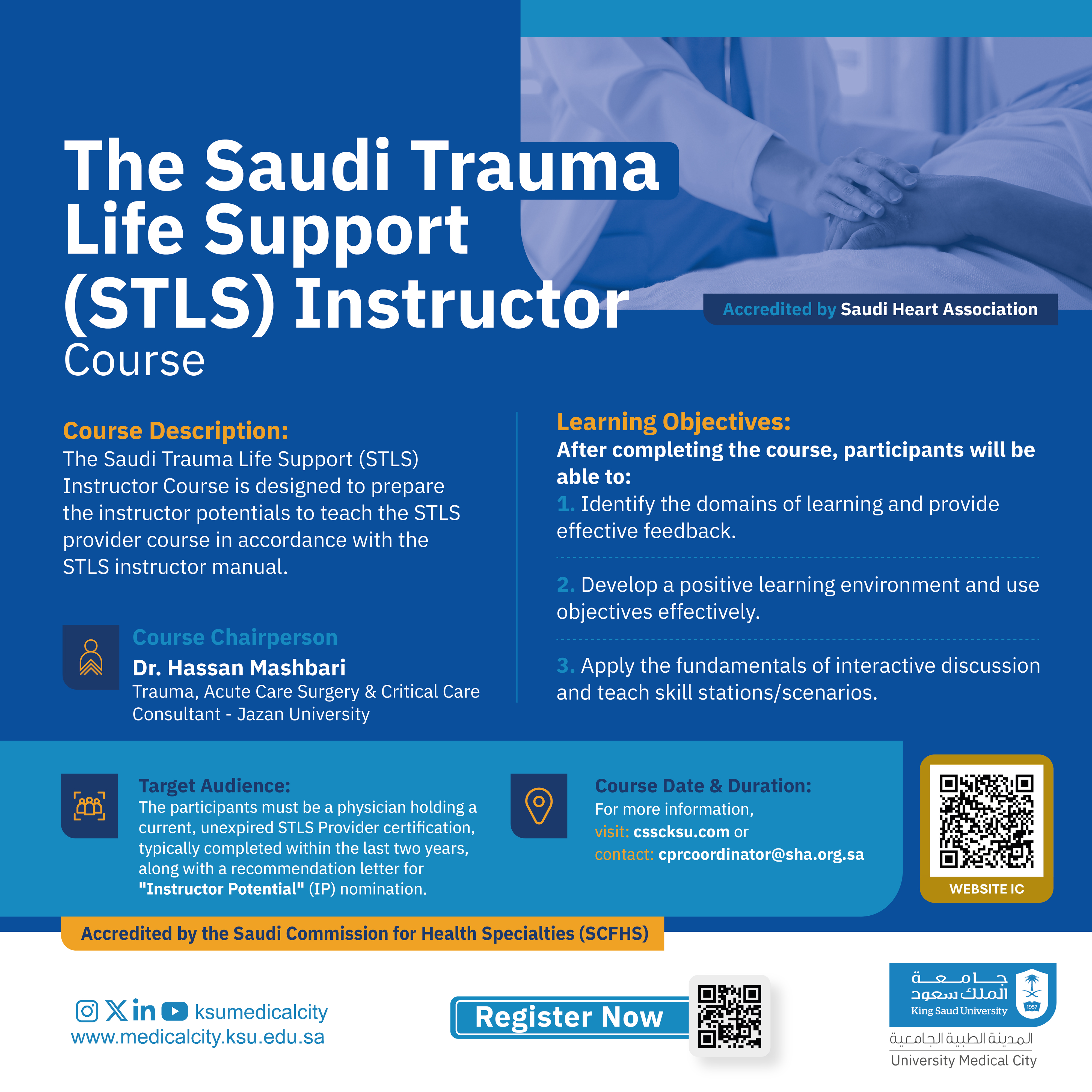 Course Description: The Saudi Trauma Life Support Course (STLS) Provider Course is designed to equip healthcare professionals with the essential knowledge and skills required to effectively and safely manage trauma-related emergencies.